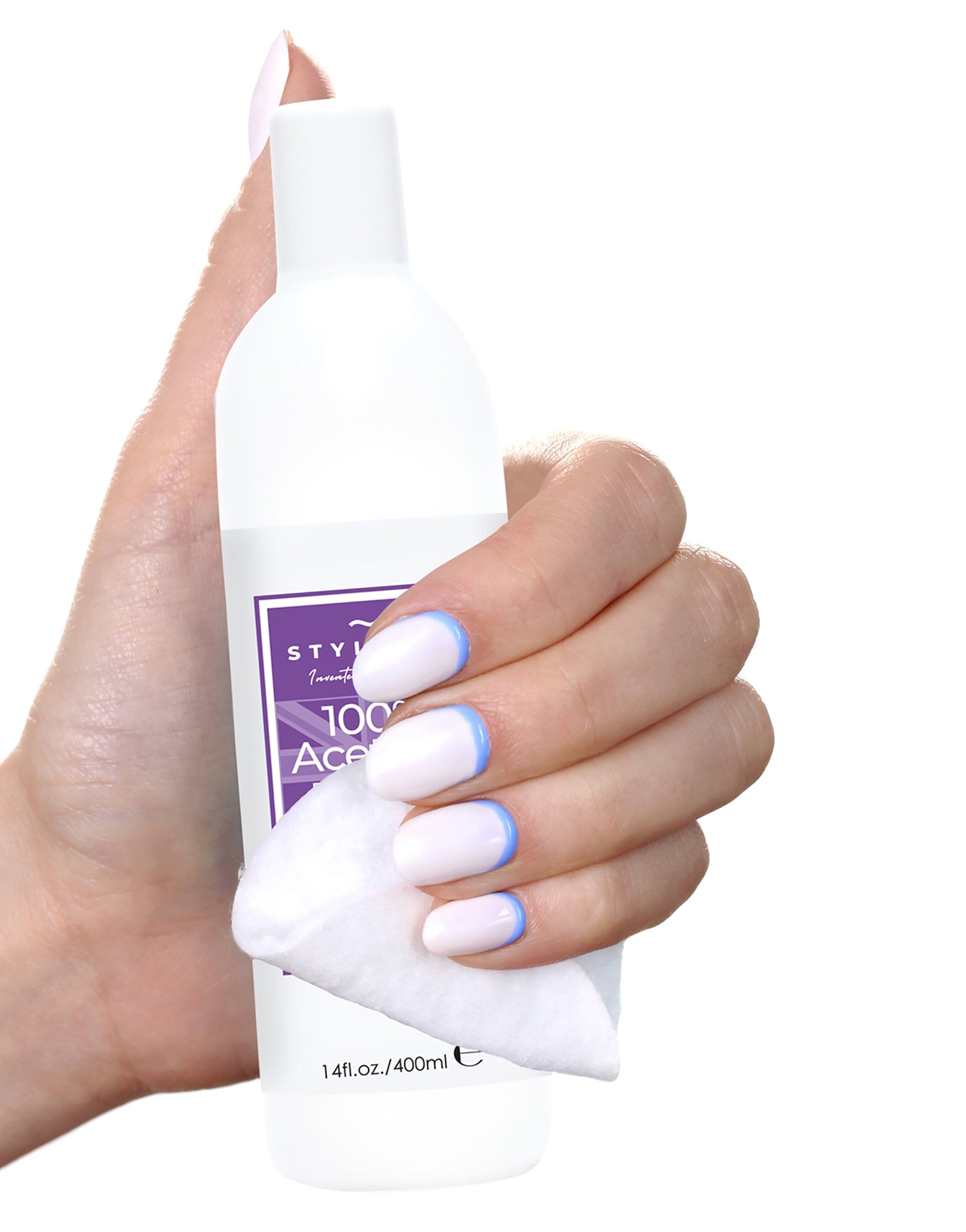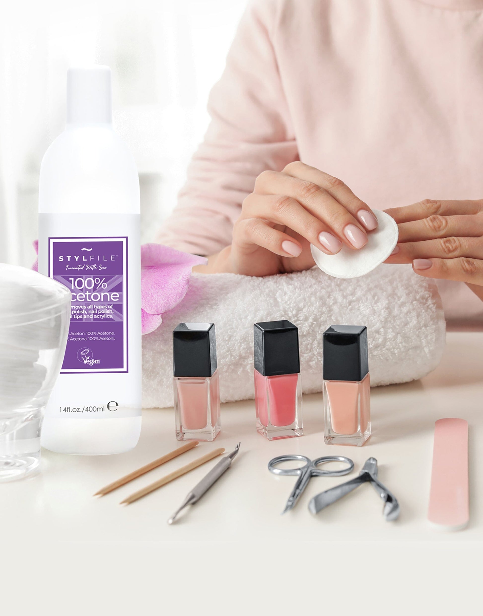 STYLFILE Gel Nail Polish Remover fully lifts gel polish, shellac, and nail art, in less than 15 minutes. Damage can be caused to the natural nail from incorrect removal, but the STYLFILE Gel Polish Remover is 99% acetone to ensure nail strength is not affected and polish completely lifted.
