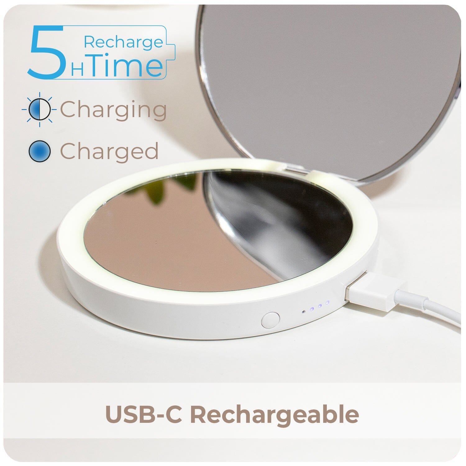 The STYLPRO Flip ‘n’ Charge is charged using the USB-C cable provided, plug the USB-C cable in to the side of the mirror and attach to any USB-C-friendly port. Four blue lights will appear next to the button when fully charged. Each blue light equals 25% of battery capacity. You can charge on the go with your laptop, or at home.