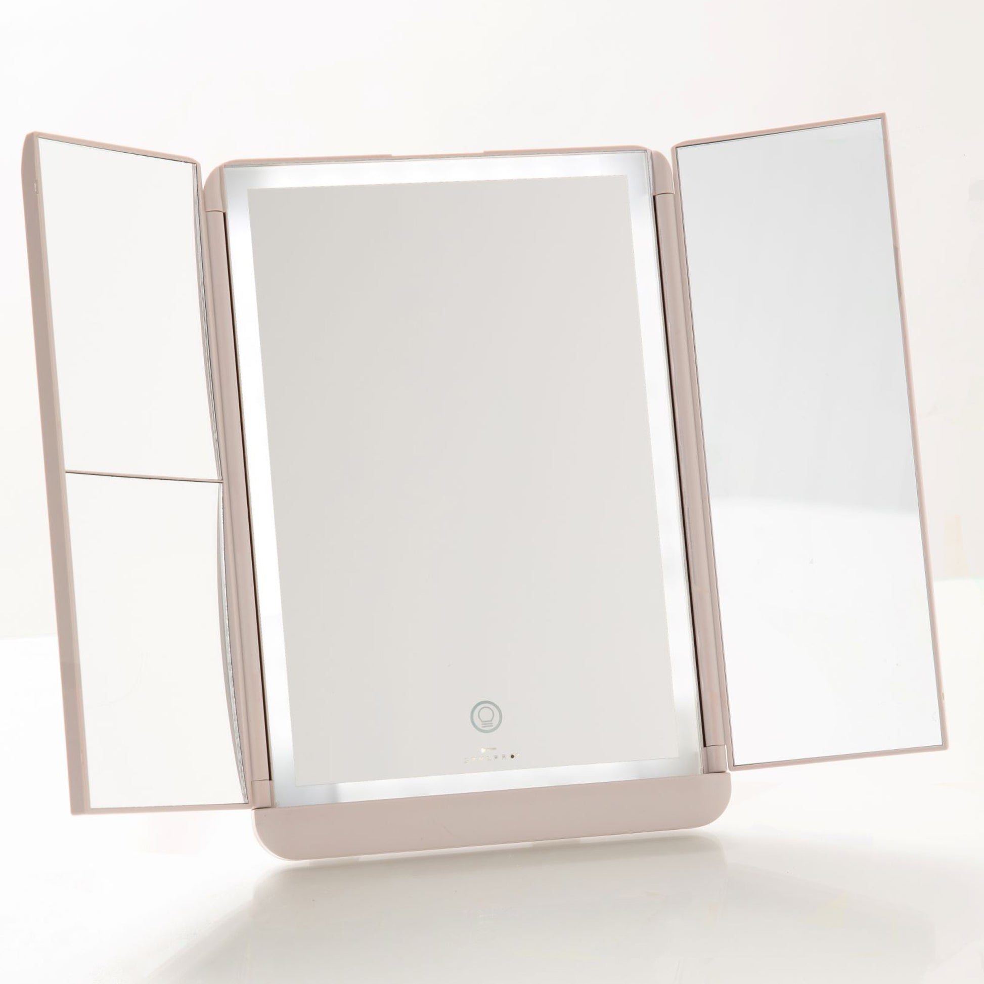 With dimmable LED light panels adjustable at the touch of a button, this portable mirror ensures you always have the right lighting for immaculate application. Focus on the details with our 4 mirror perspectives and bi-folding panels. Open up the book for well-lit looks, as you unfold 2 bi-folding panels; one with a 2x magnifying quarter and a 5x magnifying quarter and a normal focus panel to catch your look from the side-profile.